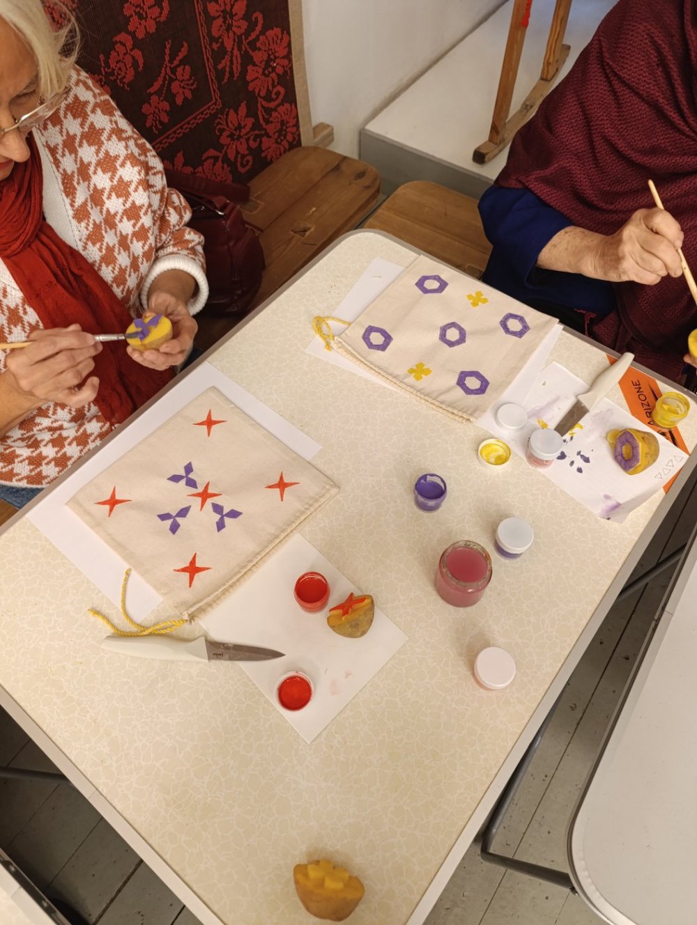 Спачатку ўдзельнікі майстар-класа пазнаёміліся са старажытнай тэхнікай упрыгожвання тканіны. Раней аздабленне рабілася пад стук драўлянага малатка з дапамогай дошчачак-клішэ з рэльефным арнаментам — набіванкай. Пад рукой тады не заўсёды былі патрэбныя прылады працы. Але людзі праяўлялі кемлівасць! Для набіванкі часта выкарыстоўвалі не толькі драўляныя штампы, але і выразаныя з сырой бульбы, рэпы ці морквы. Гэты працэс ласкава называлі «цацкаванне». У Музеі традыцыйнага ручнога ткацтва Паазер’я ўдала аднавілі дадзеную традыцыю! Майстар-клас быў прысвечаны менавіта народнай вынаходлівасці. Пад кіраўніцтвам вядучага навуковага супрацоўніка музея Т. В. Бараненка ўдзельнікі майстар-класа з энтузіязмам узяліся за стварэнне ўласных штампаў з бульбы з нескладаным геаметрычным узорам. Потым наступіў самы цікавы момант — дэкарыраванне тканіны. Усе праявілі сябе як сапраўдныя майстры-набойшчыкі!